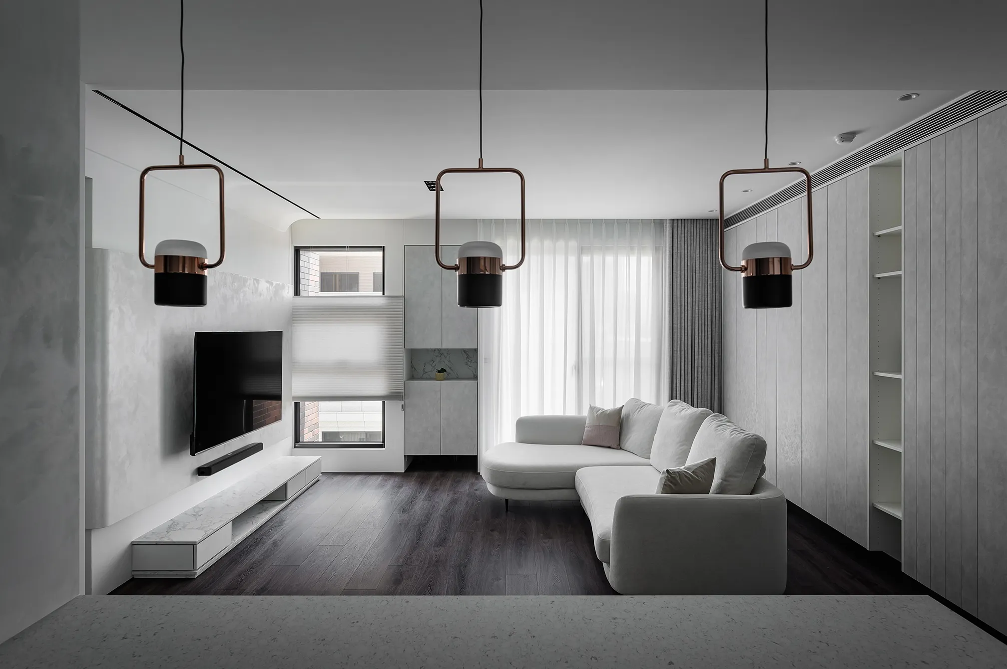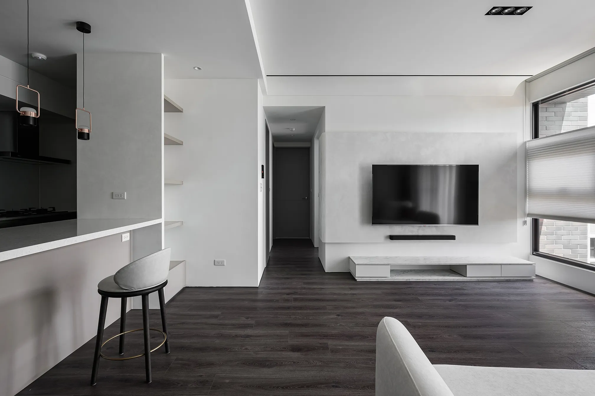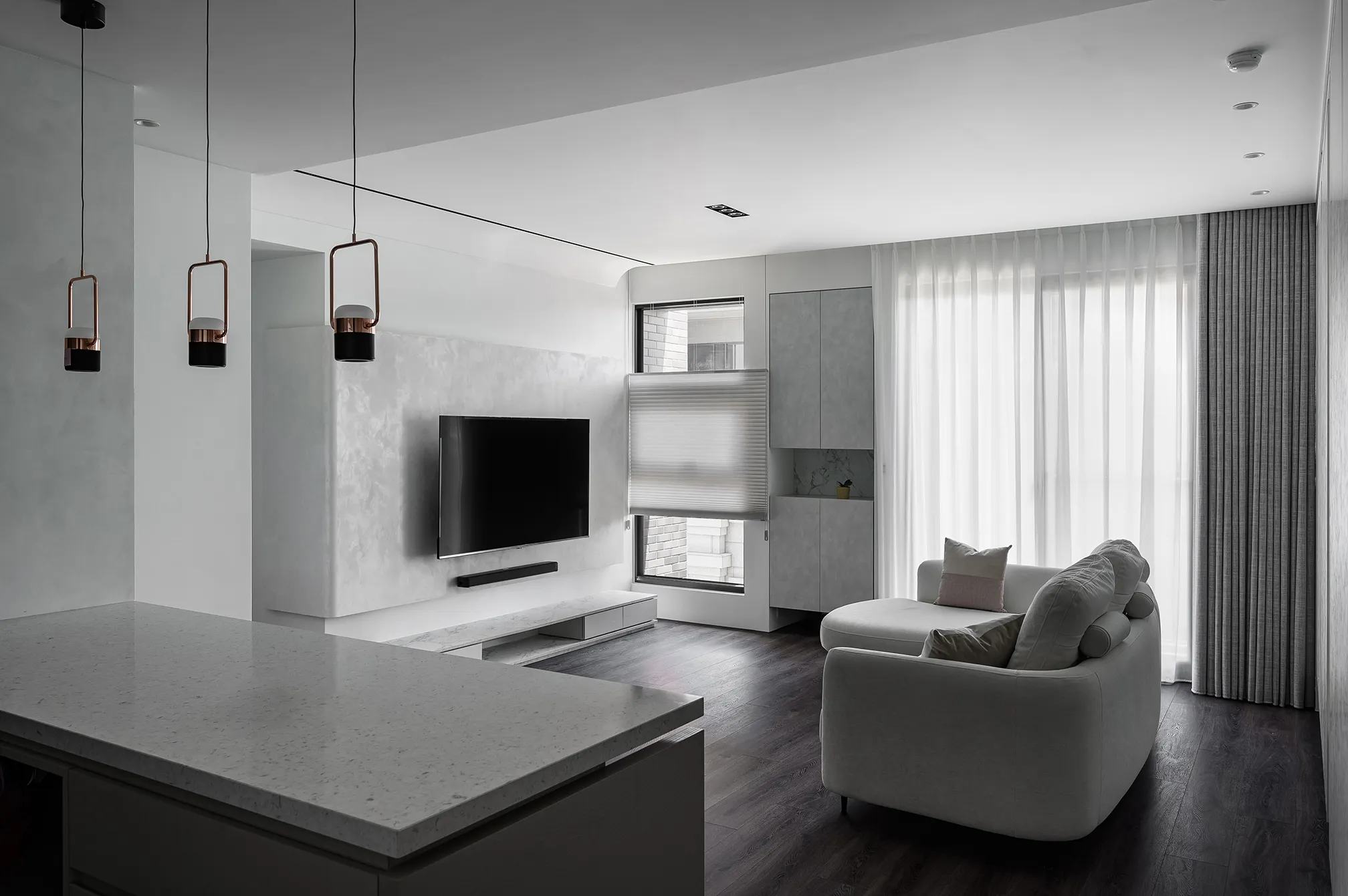 白色與灰色的主色交織,詮釋出現代極簡的平靜氛圍。硬體線條強調流暢延伸,再與其搭配家具軟件的動線,沒有多餘的贅飾,突顯空間的清爽感,使整體氛圍舒適減壓。