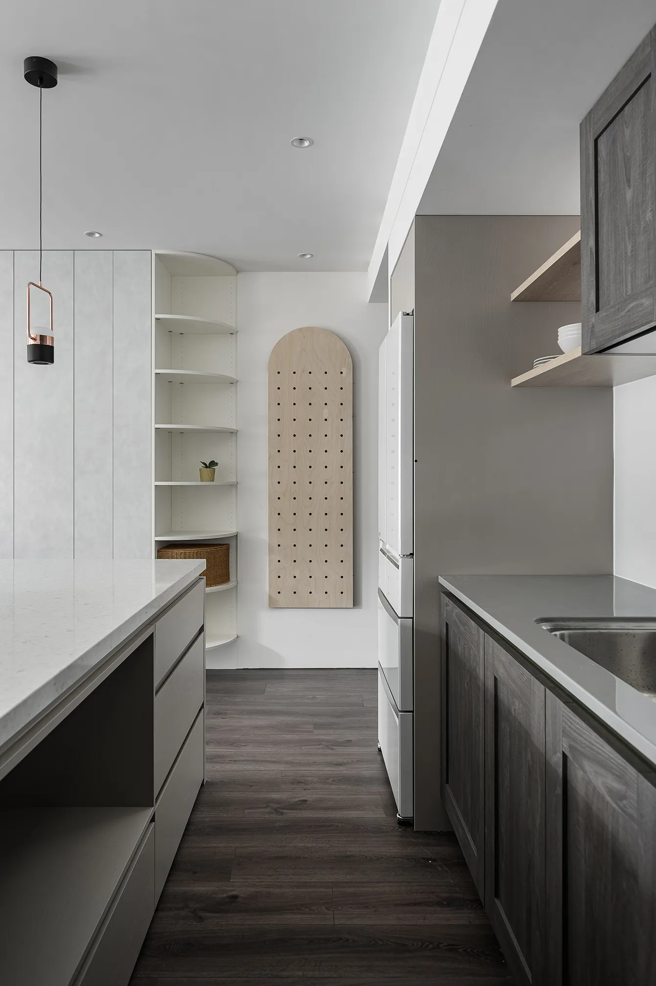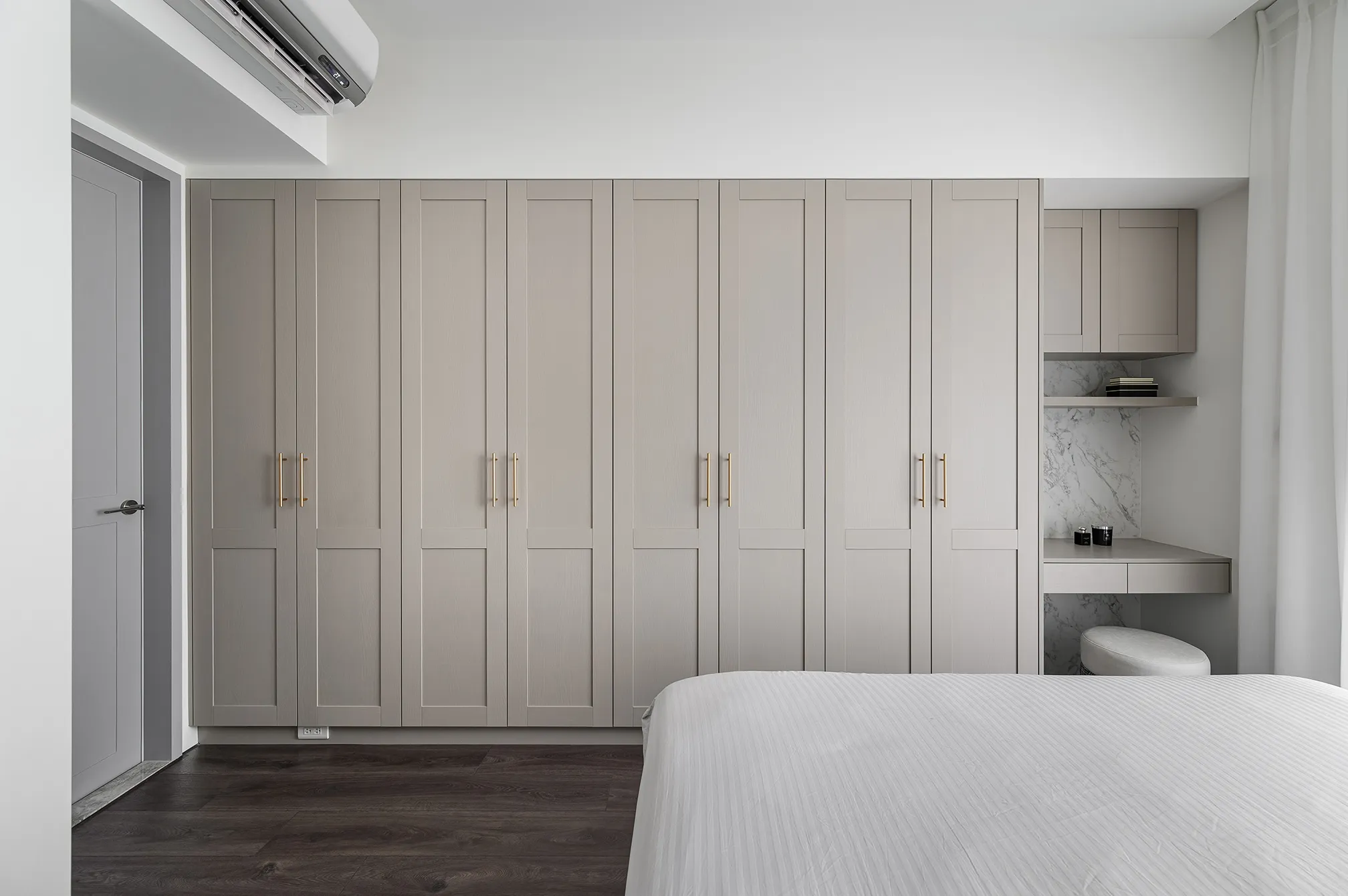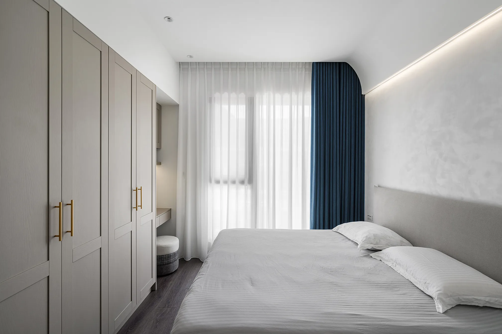 白色與灰色的主色交織,詮釋出現代極簡的平靜氛圍。硬體線條強調流暢延伸,再與其搭配家具軟件的動線,沒有多餘的贅飾,突顯空間的清爽感,使整體氛圍舒適減壓。