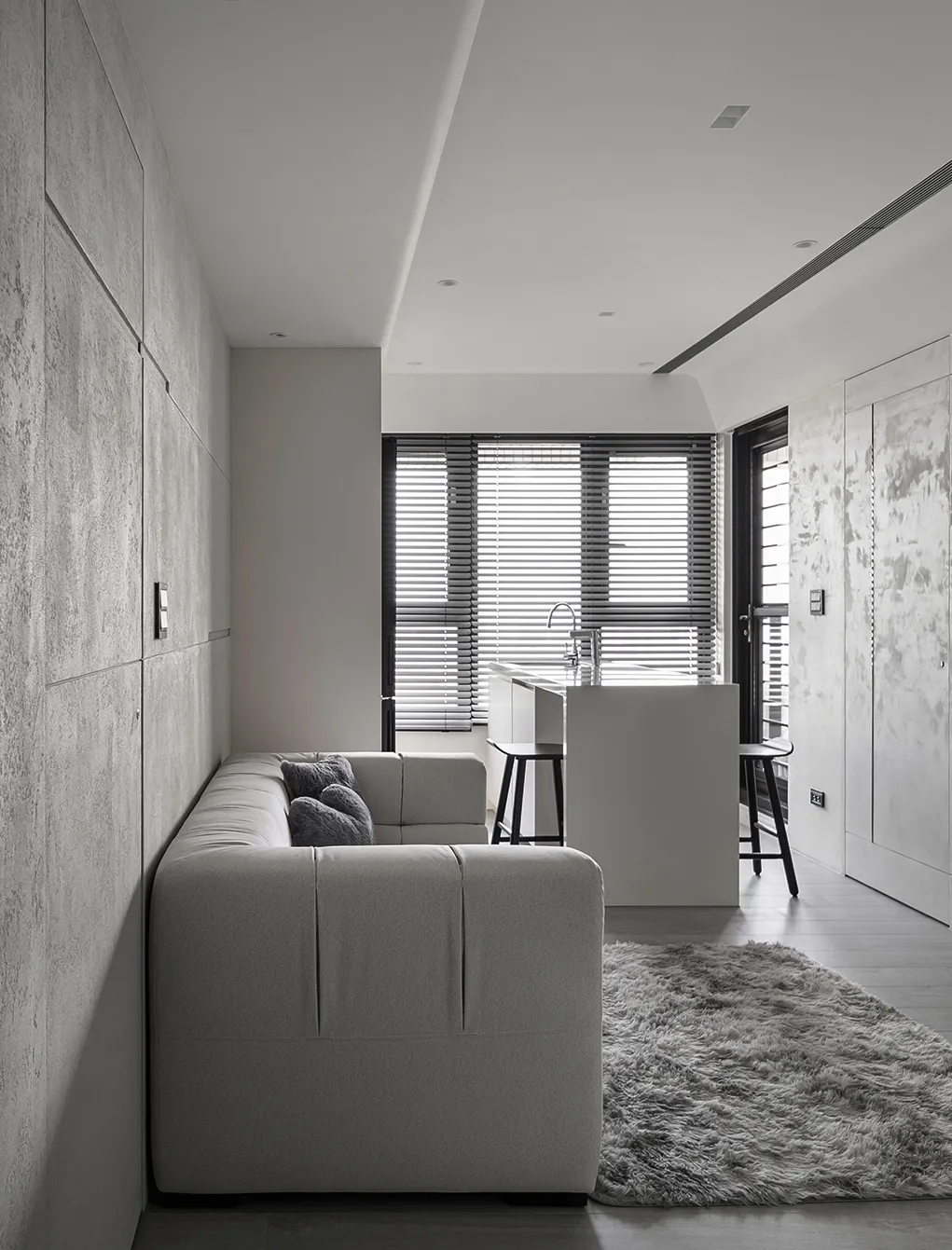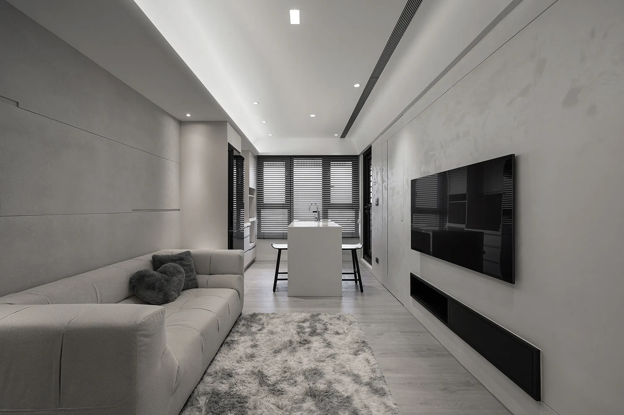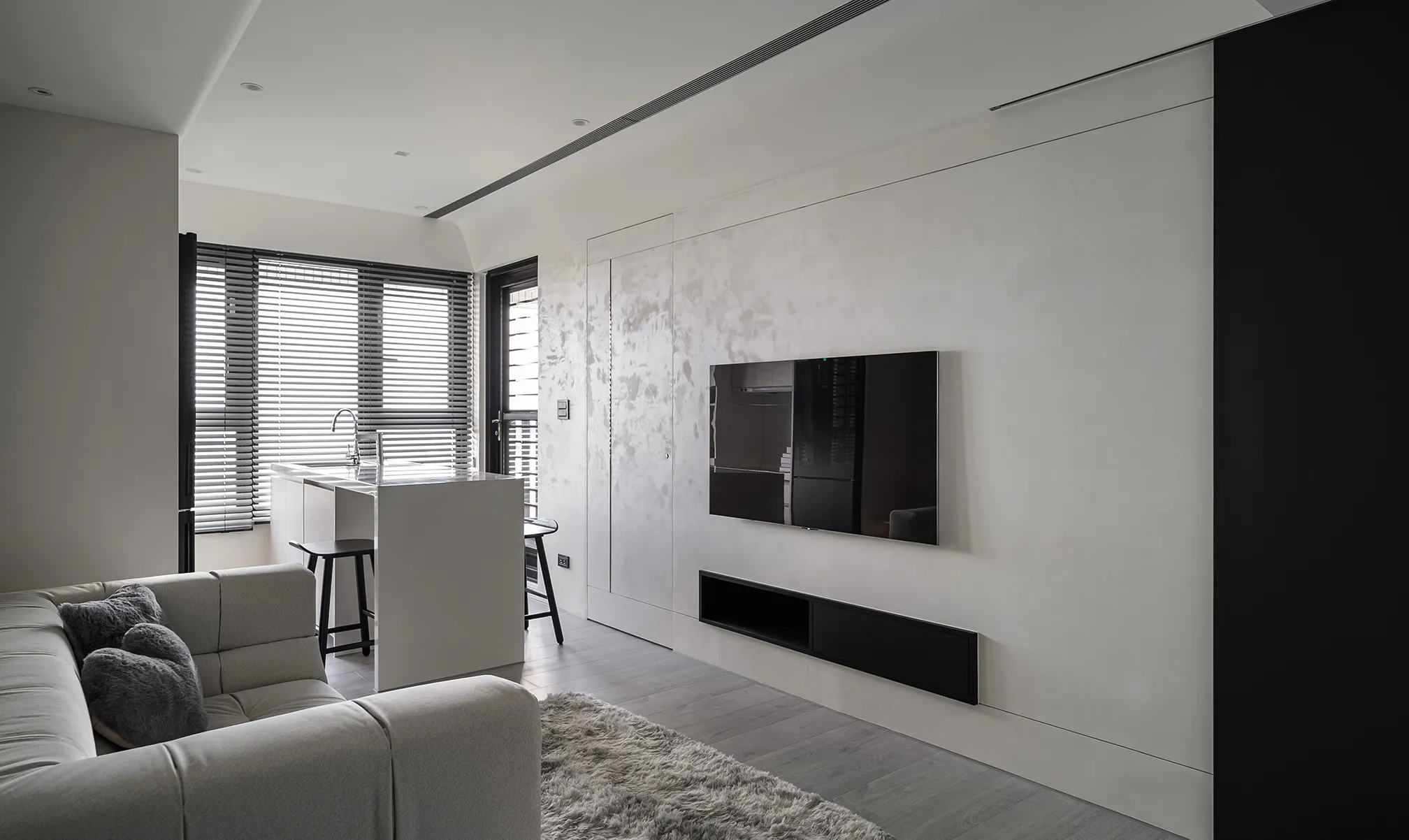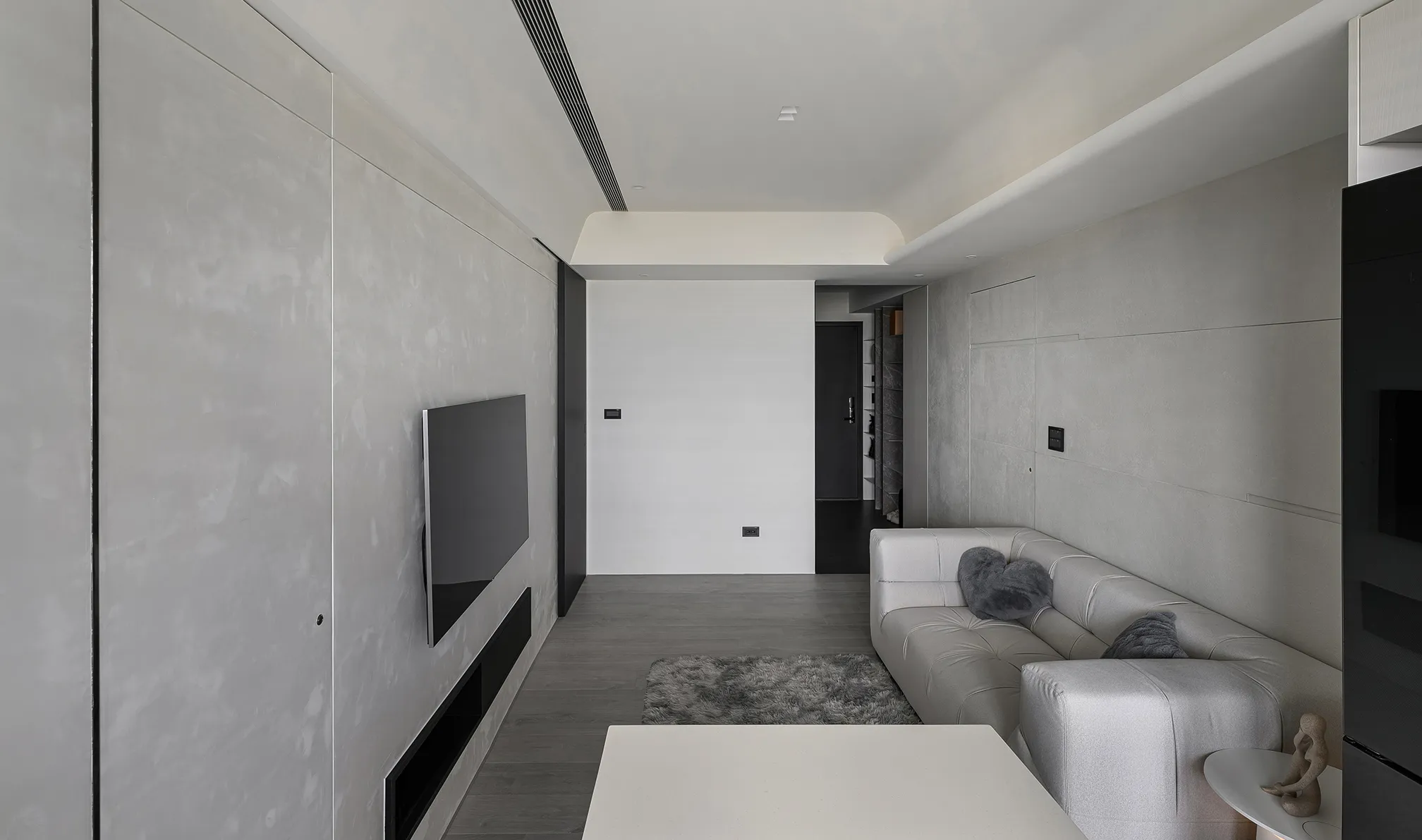 天、地、壁三面向的精神環環相扣,互相呼應主體為低彩度的色階,亦能呈現乾淨舒適的氛圍製作大面積的延伸,模糊空間的截斷點天花柔和的線條,做為修飾櫃體的媒介,同時強調視覺上的延續感。
