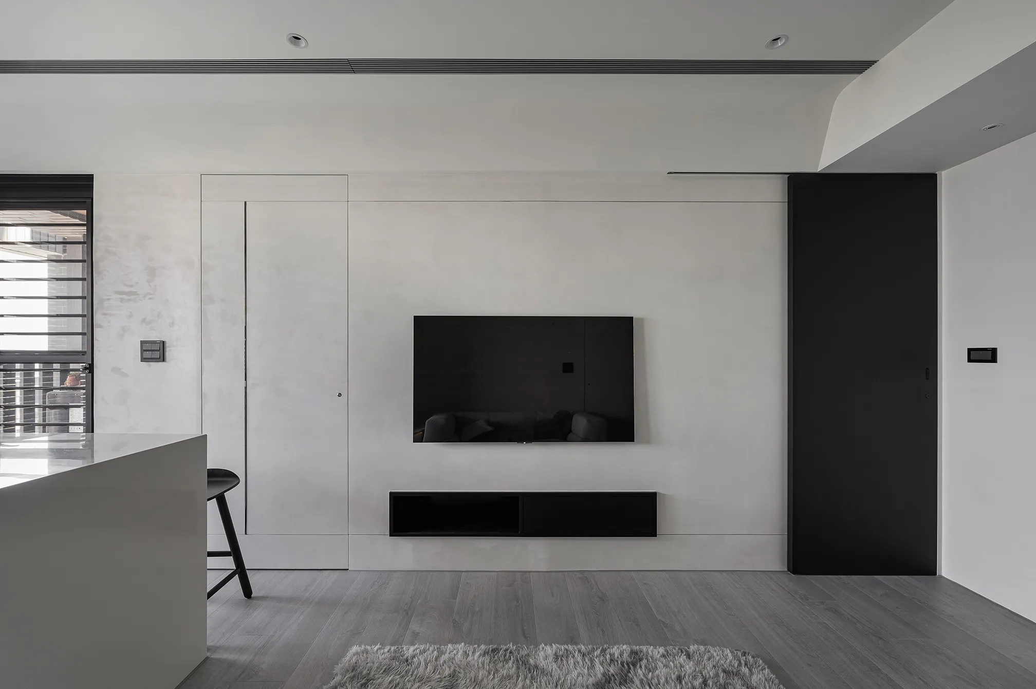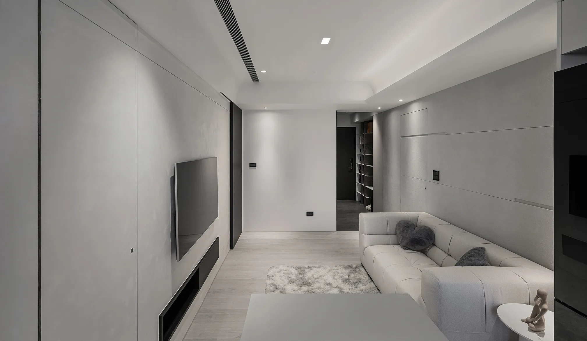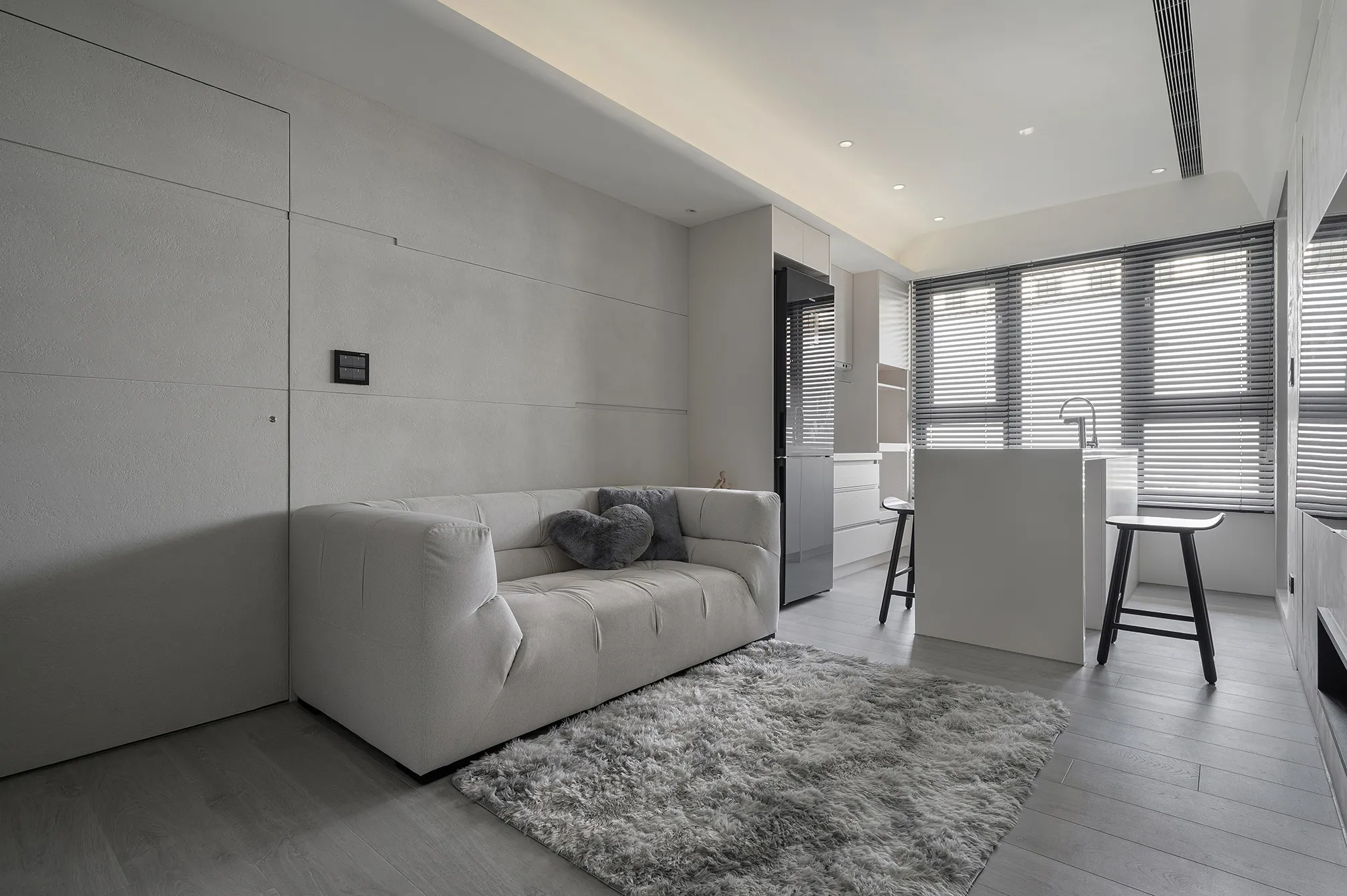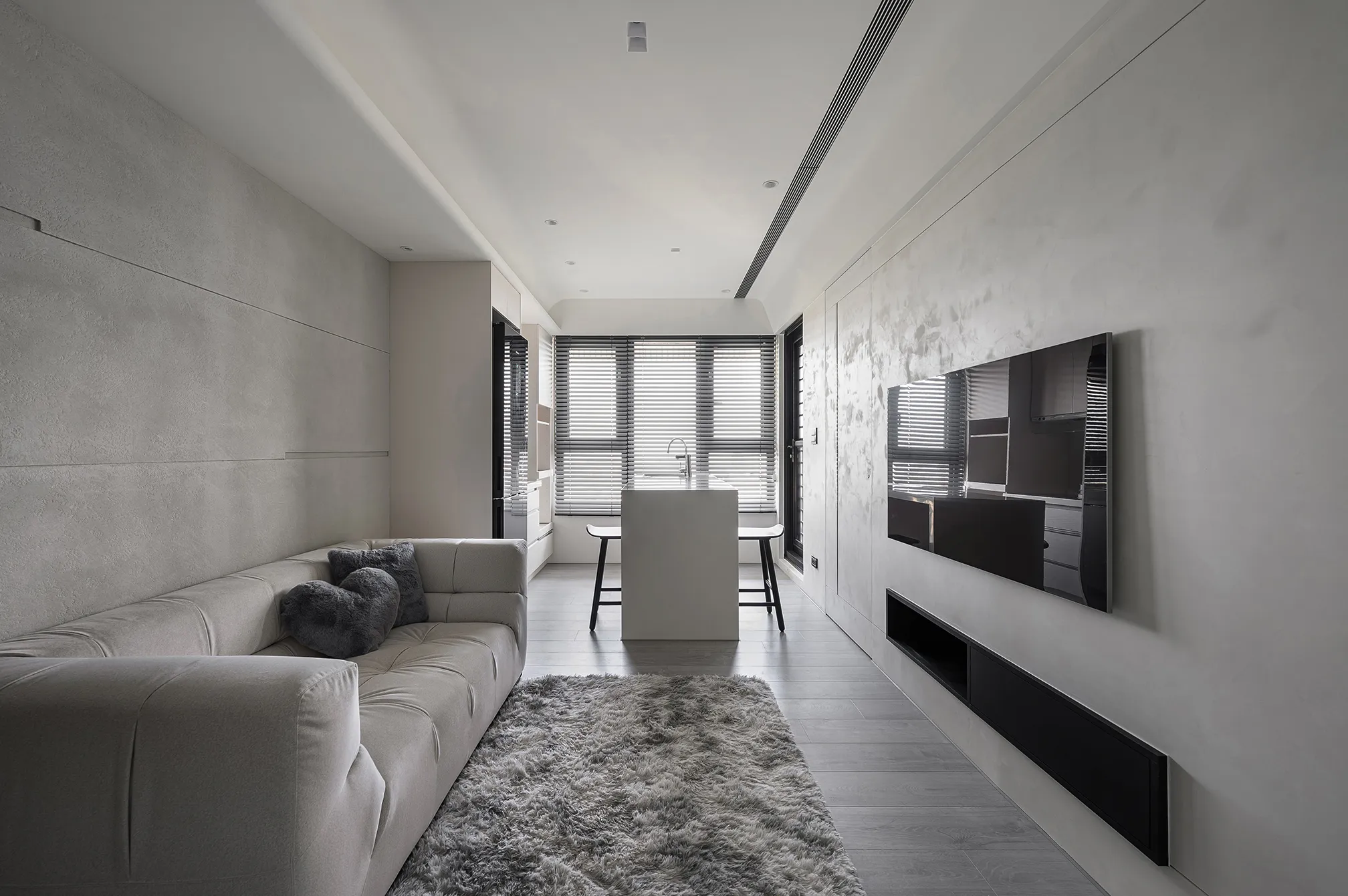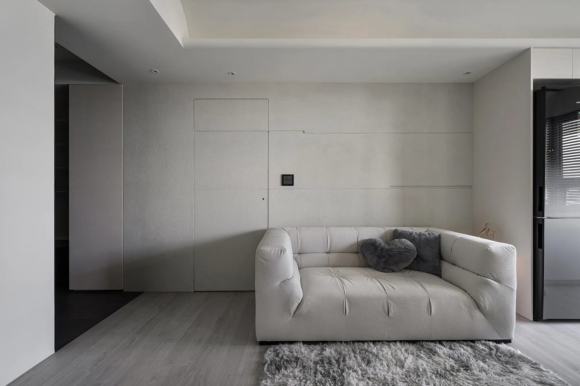 天、地、壁三面向的精神環環相扣,互相呼應主體為低彩度的色階,亦能呈現乾淨舒適的氛圍製作大面積的延伸,模糊空間的截斷點天花柔和的線條,做為修飾櫃體的媒介,同時強調視覺上的延續感。