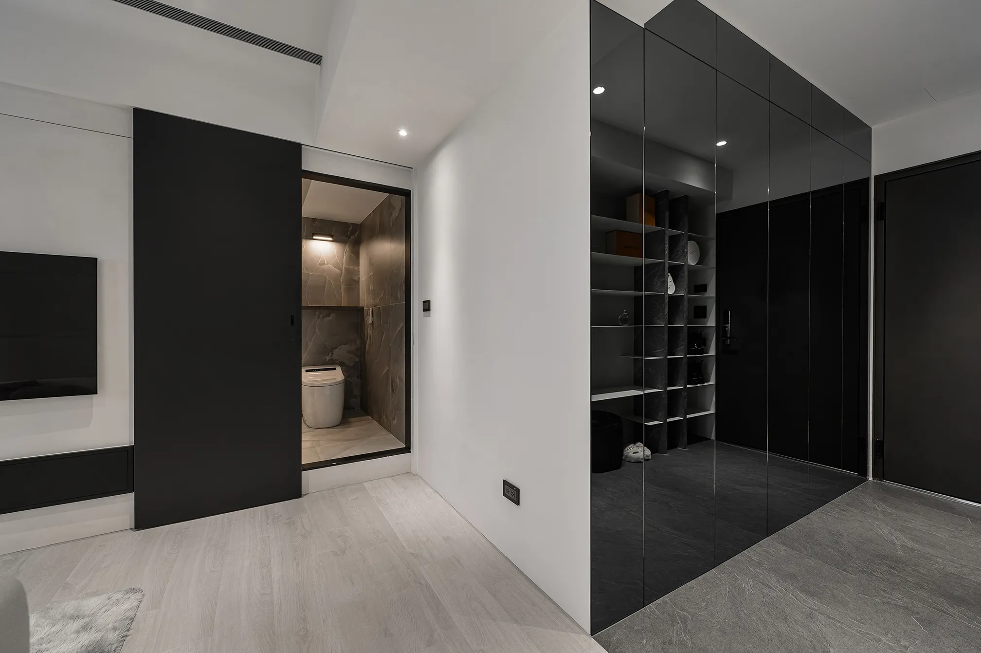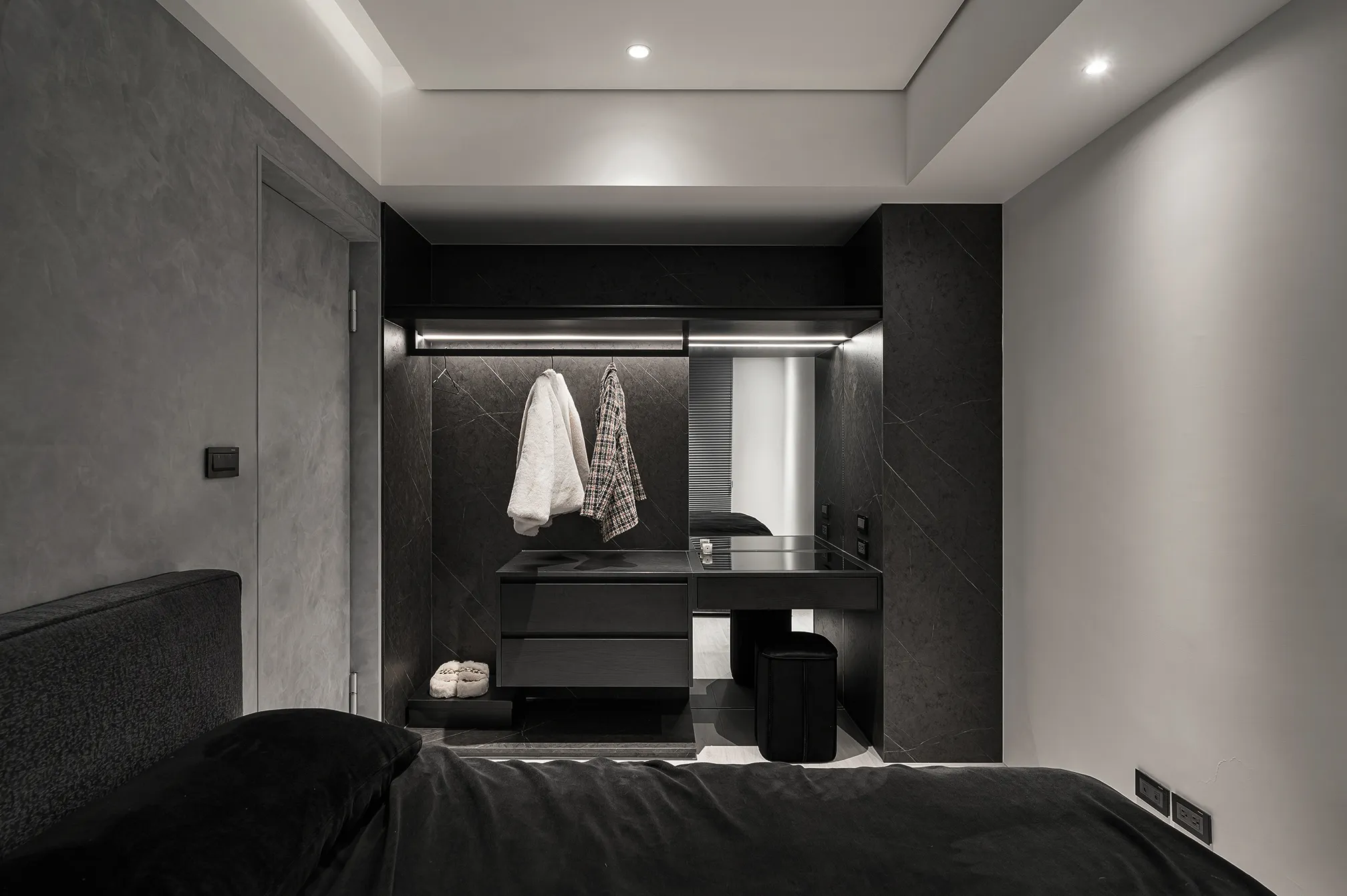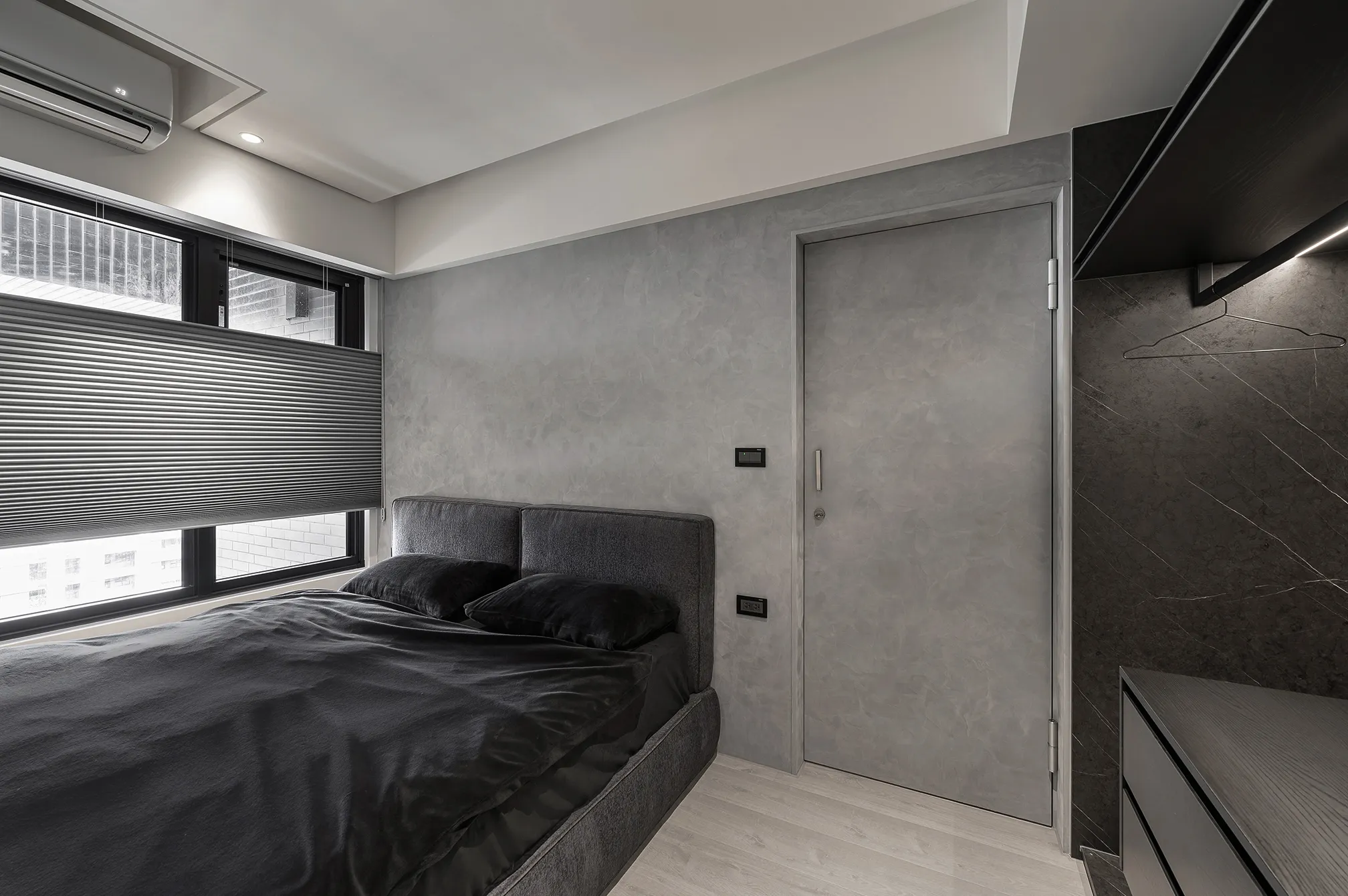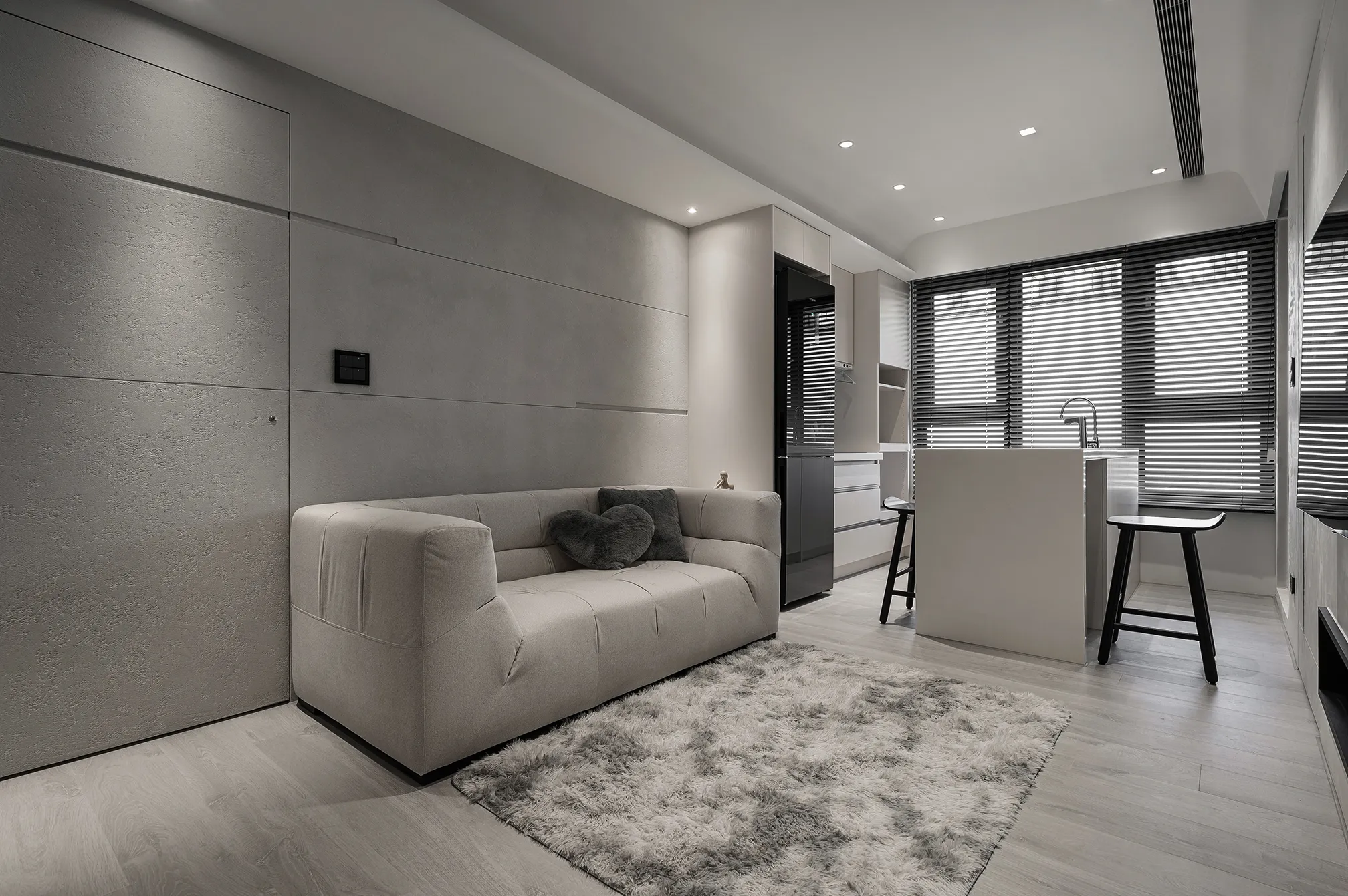 天、地、壁三面向的精神環環相扣,互相呼應主體為低彩度的色階,亦能呈現乾淨舒適的氛圍製作大面積的延伸,模糊空間的截斷點天花柔和的線條,做為修飾櫃體的媒介,同時強調視覺上的延續感。